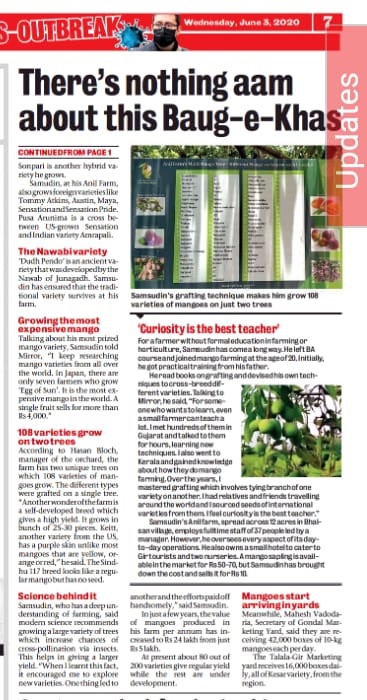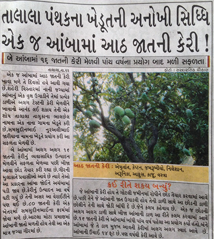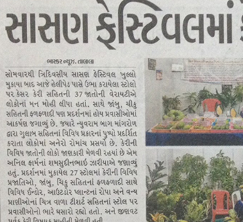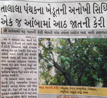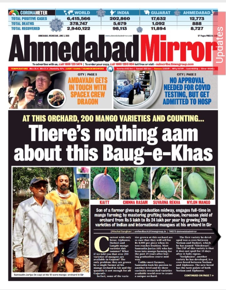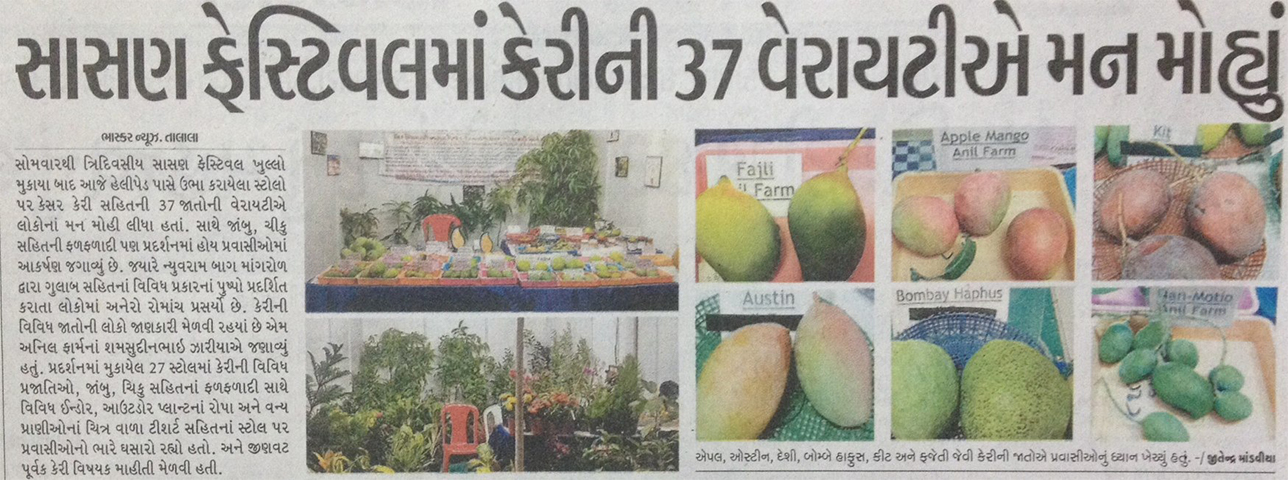 News Divyabhaskar article on Anil Farm about Japanese Irvine Apple Mango Ahmedabad Mirror Cover Story - Anil Mango Farm Ahmedabad Mirror Cover Story - Anil Mango Farm સાસણ ફેસ્ટીવલમાં કેરીની 37 વેરાયટીએ મન મોહયું તલાલા પંથકના ખેડૂતની અનોખી સિદ્ધિ